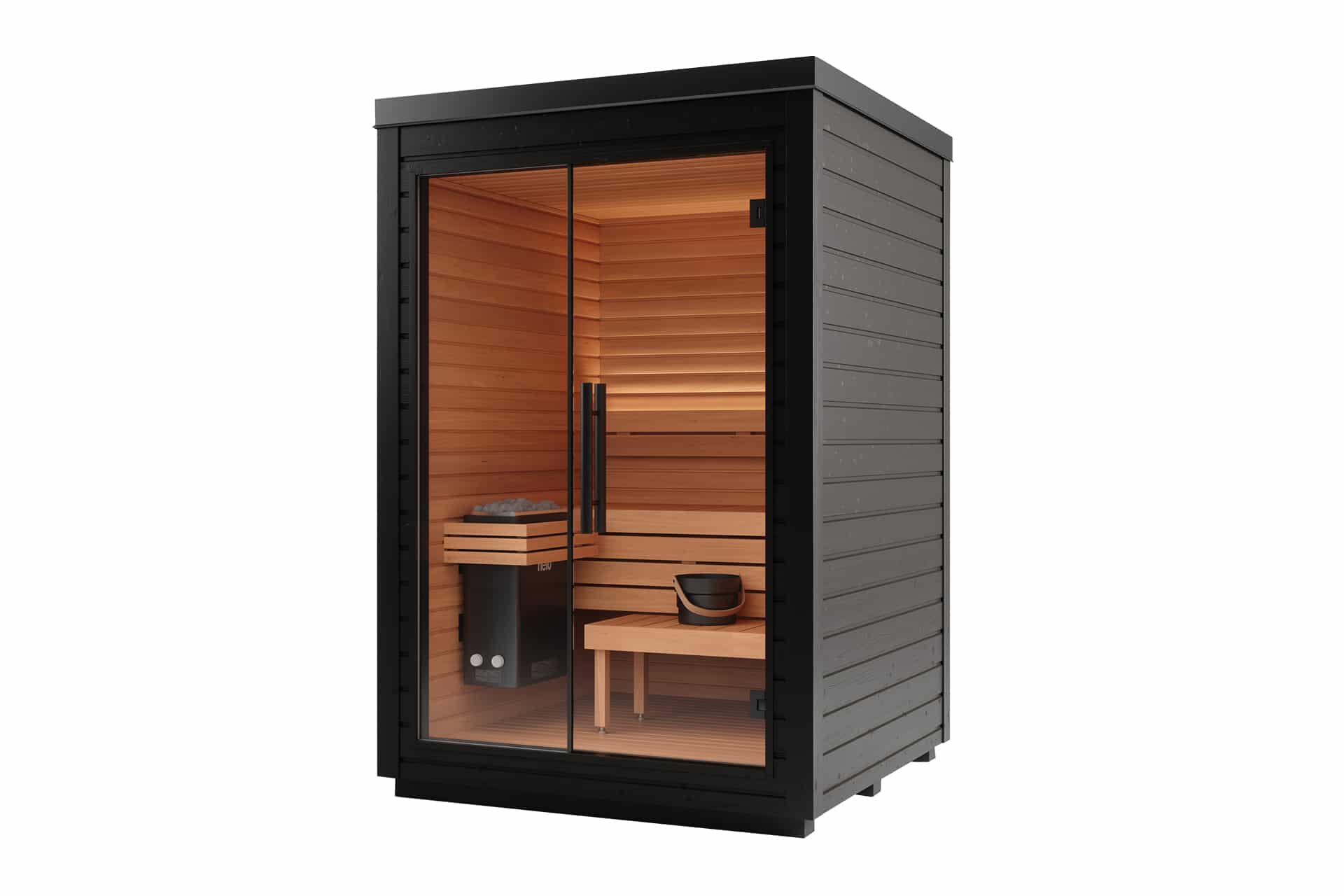 Le sauna extérieur Mira est disponible en deux tailles : Mira S est conçu pour s’adapter aux espaces les plus restreints, tandis que Mira L offre un peu plus de largeur pour plus de confort.